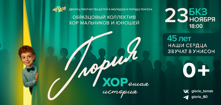Хоровой студии мальчиков и юношей «Глория» Томского дворца творчества детей и молодёжи в этом году исполняется 45 лет. За эти годы обучение в студии прошли тысячи мальчиков и юношей нашего города. Ежегодно ребята принимают участие в муниципальных, региональных, всероссийских конкурсах, в телемарафонах, благотворительных мероприятиях. Традицией стали концерты хора в Органном зале томской филармонии, посвящённые Рождеству, 8 марта, Дню Победы. В репертуаре коллектива произведения русских композиторов (духовные и светские), лучшие образцы зарубежной классики, русские народные песни, произведения современных авторов.