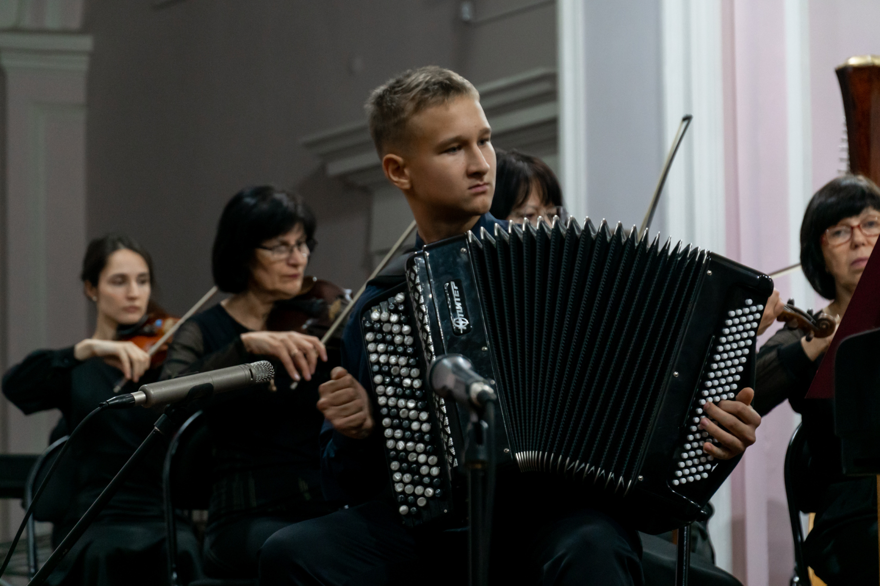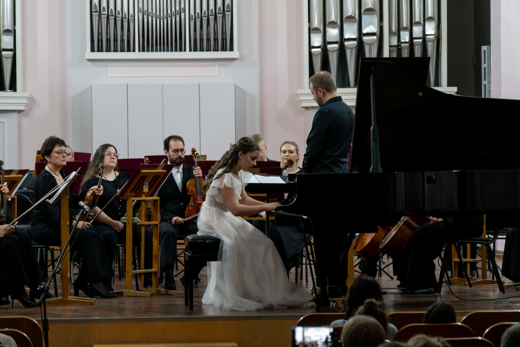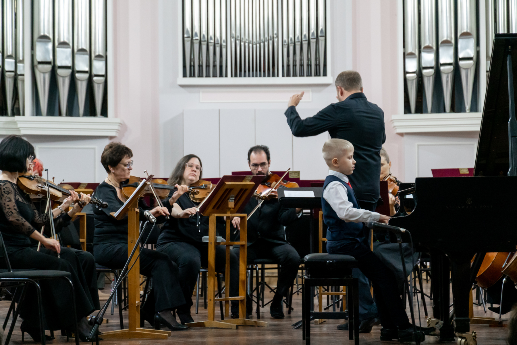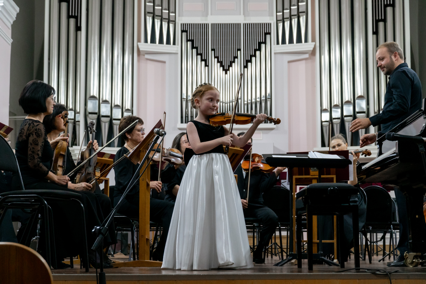 В этот вечер с Томским академическим симфоническим оркестром под управлением главного дирижера Игоря Берендеева выступили 16 юных музыкантов из Томска, Северска, Первомайского, Каргаска и Стрежевого. Возраст самого младшего участника – 7 лет.