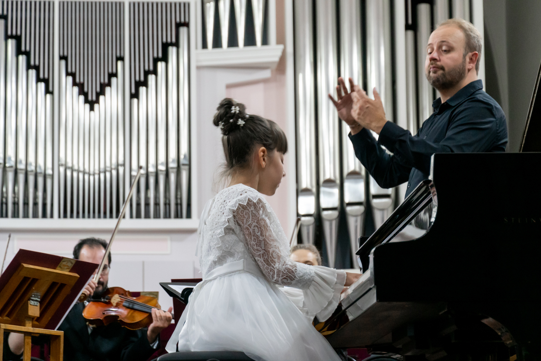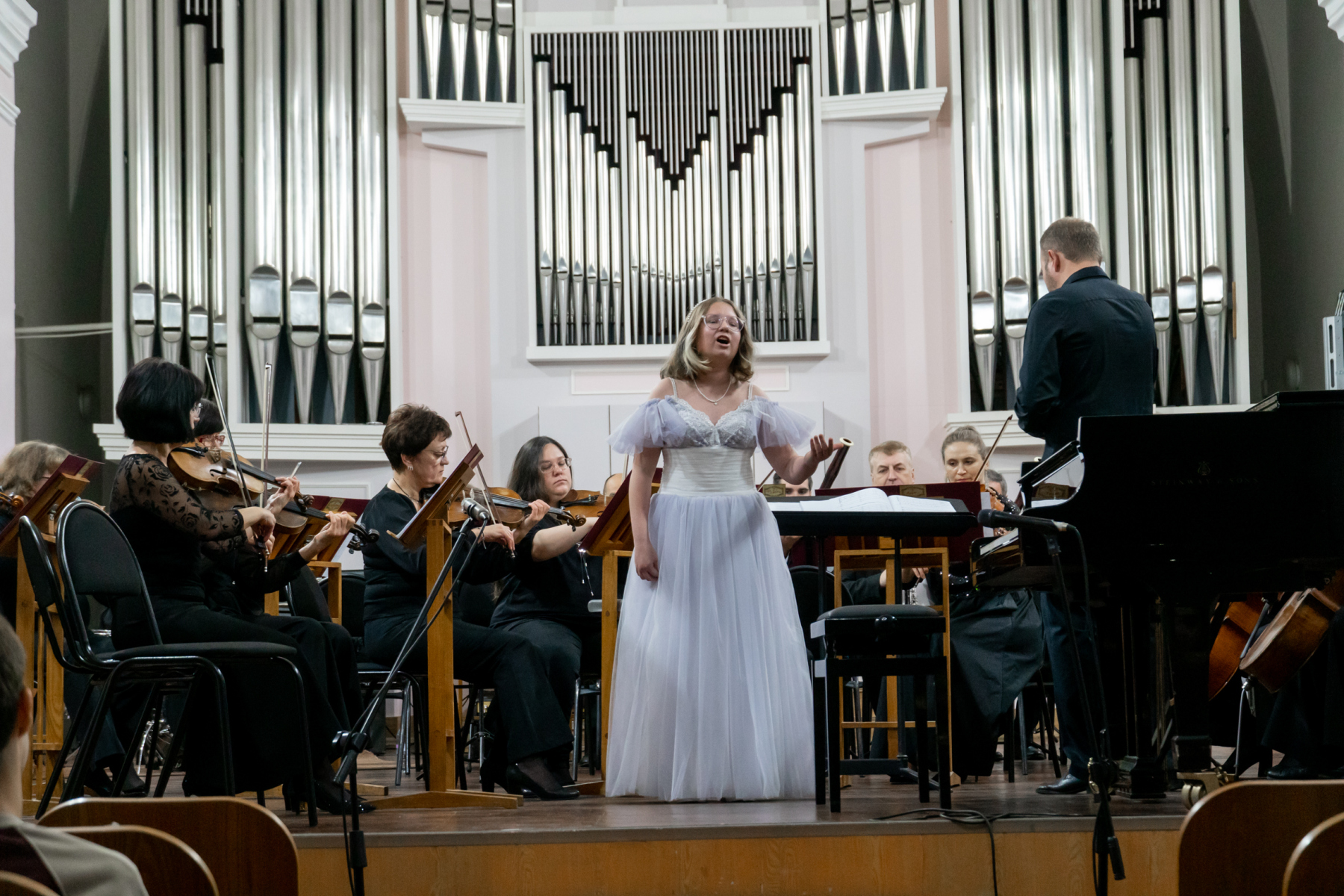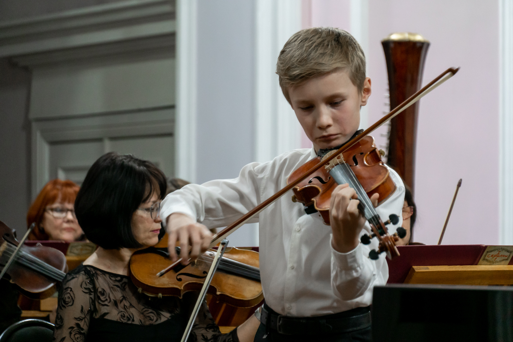 В этот вечер с Томским академическим симфоническим оркестром под управлением главного дирижера Игоря Берендеева выступили 16 юных музыкантов из Томска, Северска, Первомайского, Каргаска и Стрежевого. Возраст самого младшего участника – 7 лет.