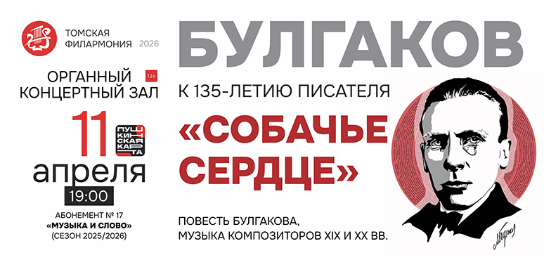 Для встречи двух творческих стихий выбраны сочинения современника М.А. Булгакова Дмитрия Шостаковича: его дерзкая «Полька-шарманка» и глубокая Пассакалия из Концерта № 1 для скрипки с оркестром. К булгаковскому тексту также присоединится гениальная, фантасмагорическая музыка Альфреда Шнитке и органные сочинения композиторов ХIХ и ХХ веков.