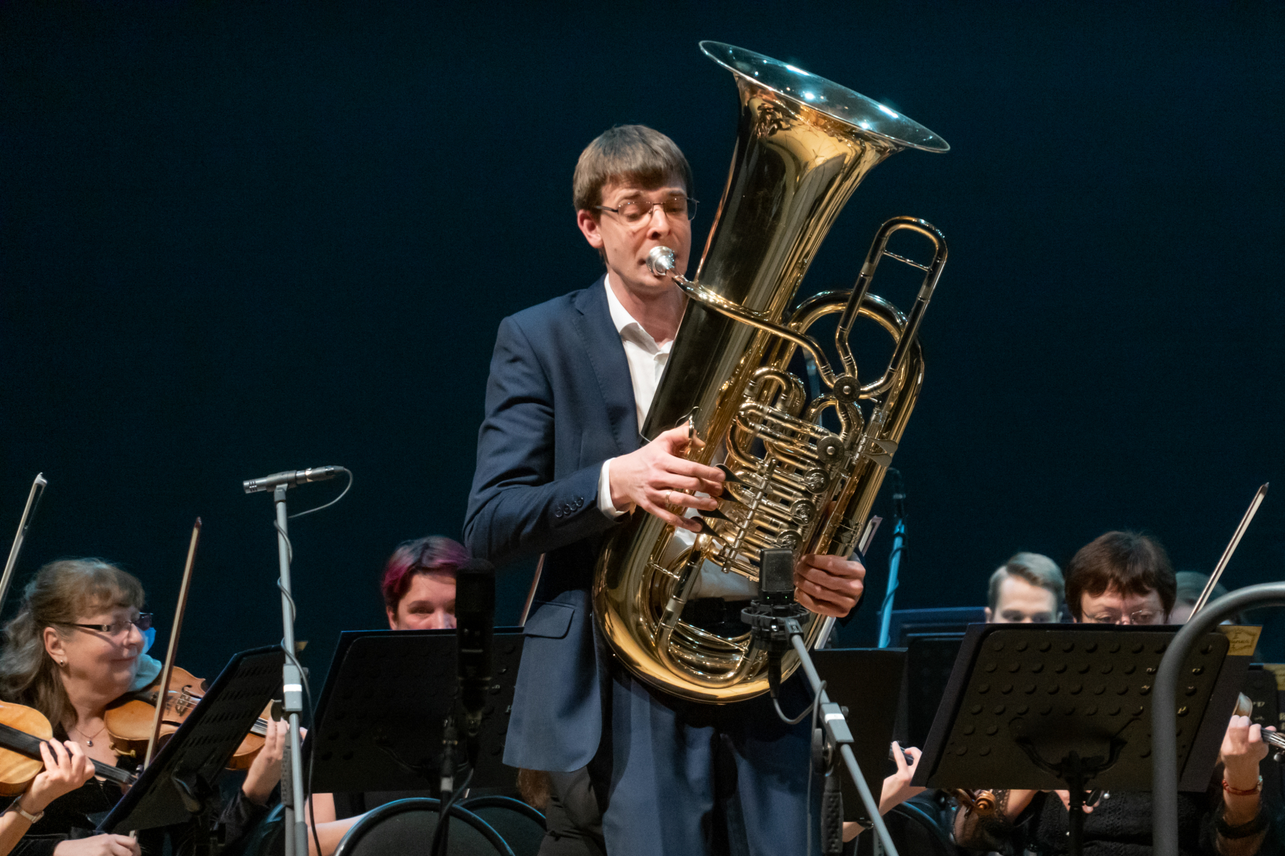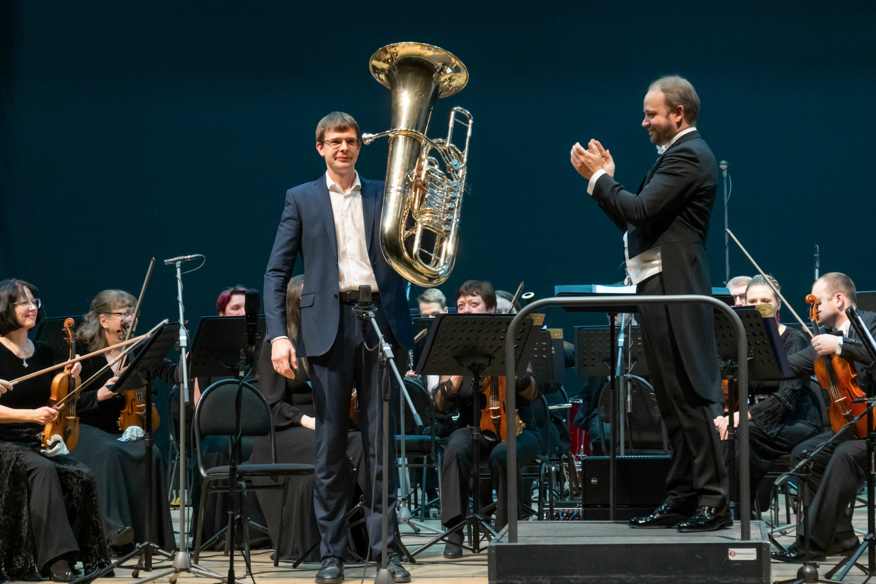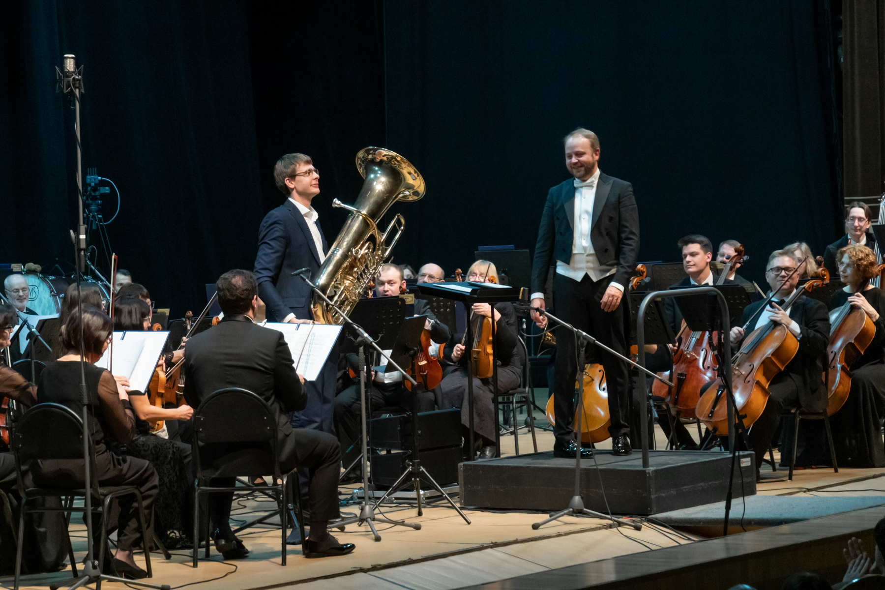 Морозная неделя в Томске стала очень жаркой на события в Томской филармонии. Кто не испугался 35-градусного мороза, зарядился энергией блестящих музыкантов – лауреатов всероссийских и международных конкурсов, солистов оркестра Мариинского театра Семена Саломатникова (труба), Федора Освера (гобой) и Федора Шагова (туба). Артисты выступили на сцене Большого концертного зала Томской филармонии вместе с Томским академическим симфоническим оркестром под управлением главного дирижера Игоря Берендеева 10 декабря. Этот день навсегда войдет в историю томской культуры.